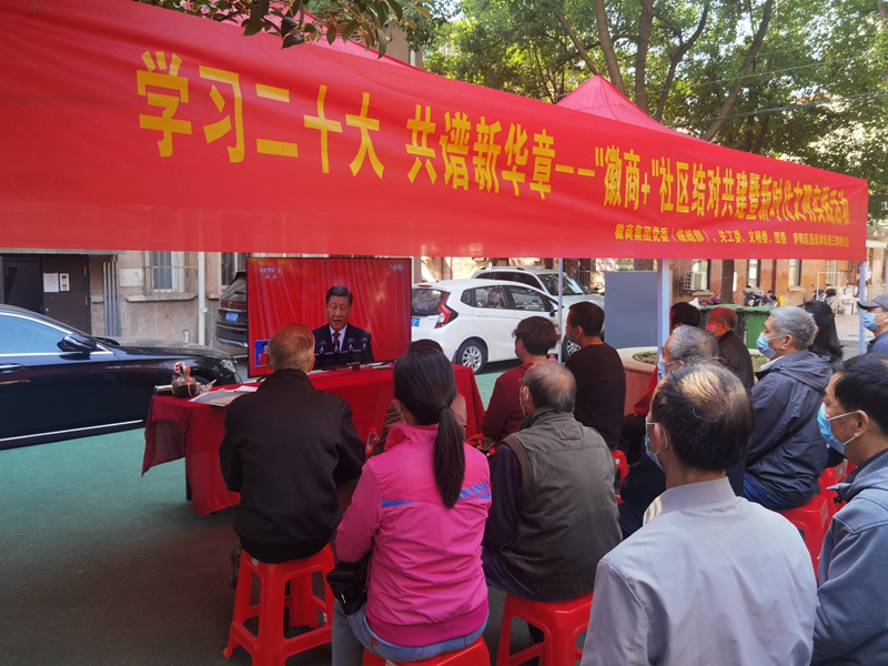 在商之都的各大商場內(nèi),電子屏循環(huán)播放著“學(xué)習(xí)二十大,永遠(yuǎn)跟黨走,奮進(jìn)新征程”“喜迎二十大,奮進(jìn)新征程“宣傳字幕。合肥中心廣場組織黨員、賣場主管以上人員、國生電器及紅府超市員工代表以集體唱紅歌、升國旗的形式慶祝黨的二十大勝利召開??偛奎h支部、國生電器黨支部、合肥中心廣場黨支部黨員走進(jìn)三牌樓社區(qū),與社區(qū)黨委聯(lián)合開展了“學(xué)習(xí)二十大 共譜新華章——‘徽商+’社區(qū)結(jié)對共建暨新時代文明實(shí)踐活動”,和社區(qū)里的退休黨員群眾一起收看了二十大開幕盛況,并上門為省經(jīng)信委機(jī)械小區(qū)居民清洗空調(diào)。