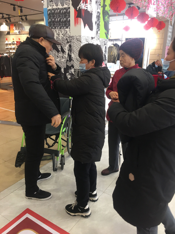 下午4時許,一對耄耋老人進(jìn)入商場內(nèi),老先生坐在輪椅上,老伴推著。在阿迪專柜旁邊的通道,老奶奶在老先生的耳邊叮囑了幾句,便徑直乘扶梯上了二樓,不一會兒“名鷹”專柜的導(dǎo)購員王芳萍陪著老奶奶下樓,手里還拿著一件棉衣。原來老奶奶是給老伴選衣服去了。王芳萍給老先生穿上衣服,詢問老先生衣服合不合身,有沒有哪兒穿著不舒服。老先生很執(zhí)拗,說自己穿的衣服好好的,家里好幾件棉衣,怎么都不愿再添新衣了,借故說衣服長度不合適推掉了。老奶奶耐心地哄著老伴,繼續(xù)到二樓賣場別的專柜挑選衣服。不一會兒,她又在“雅鹿”專柜選了一件羽絨服,導(dǎo)購員葛運(yùn)運(yùn)隨即另外拿了件其他的尺碼的羽絨服跟隨下樓。葛運(yùn)運(yùn)幫老人穿好衣服,還詳細(xì)介紹這款羽絨服填充的是今年最流行的鵝絨,不僅更保暖還很輕便,長度也剛好,不會給坐在輪椅上的老人帶來不舒服感。老人經(jīng)不住老伴的勸說,試穿比較后答應(yīng)買下。