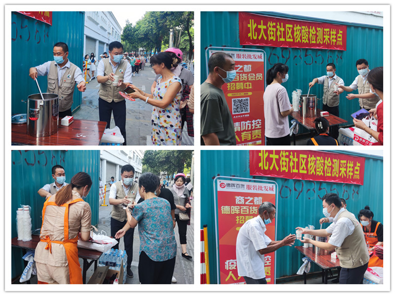為關(guān)心堅(jiān)守防疫工作一線人員,弘揚(yáng)他們無私奉獻(xiàn)的精神,讓防疫人員“安心作戰(zhàn)”,為讓市民排隊(duì)等待檢測時(shí)更加舒適,8月21日星期天上午,巢湖商廈黨支部遠(yuǎn)航志愿者服務(wù)隊(duì)為北大街社區(qū)人民路核酸檢測點(diǎn)工作人員及市民送上“一片清涼”。為了讓大家喝到冰鎮(zhèn)的綠豆湯,商之都的工作人員早上三四點(diǎn)鐘開始熬制并放入冰箱進(jìn)行冰鎮(zhèn),小小綠豆湯,小小遮陽扇,這一份份充滿愛的小“涼”方,讓現(xiàn)場的市民感動(dòng)不已。