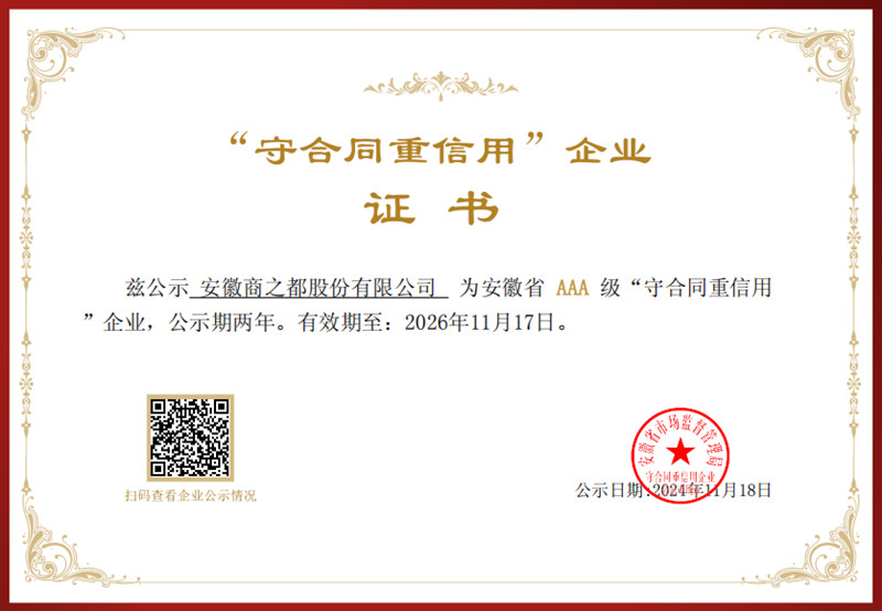 日前,安徽省市場監(jiān)督管理局舉辦的2024年度“守合同重信用”企業(yè)評選結(jié)果揭曉,安徽商之都股份有限公司憑借卓越的合同履行能力和良好的商業(yè)信譽,經(jīng)過省、市、區(qū)三級管理部門的嚴(yán)格審核與評估,脫穎而出,榮獲安徽省AAA級“守合同重信用”企業(yè)稱號。