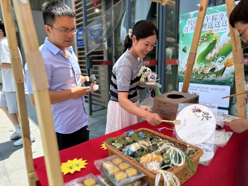 聚焦校園,5月29日-30日紅府超市合肥大學店舉辦的端午節(jié)主題活動同樣精彩。活動圍繞師生需求,設(shè)置兩大特色板塊?!棒涨槎宋纭ざY贈師恩”活動中,教師憑有效證件購物,可獲贈手工綠豆糕與定制端午紙扇,寄托對辛勤園丁的敬意與節(jié)日關(guān)懷?!皾M額有禮·福運相隨”活動面向?qū)W生,單筆消費滿18元即可參與幸運抽獎,獎品包含手工綠豆糕、端午香囊、定制紙扇等充滿節(jié)日特色的禮品,趣味抽獎吸引眾多學生踴躍參與,青春活力與端午韻味在超市內(nèi)交融。充滿端午元素的裝飾,也讓師生沉浸式感受傳統(tǒng)節(jié)日魅力。