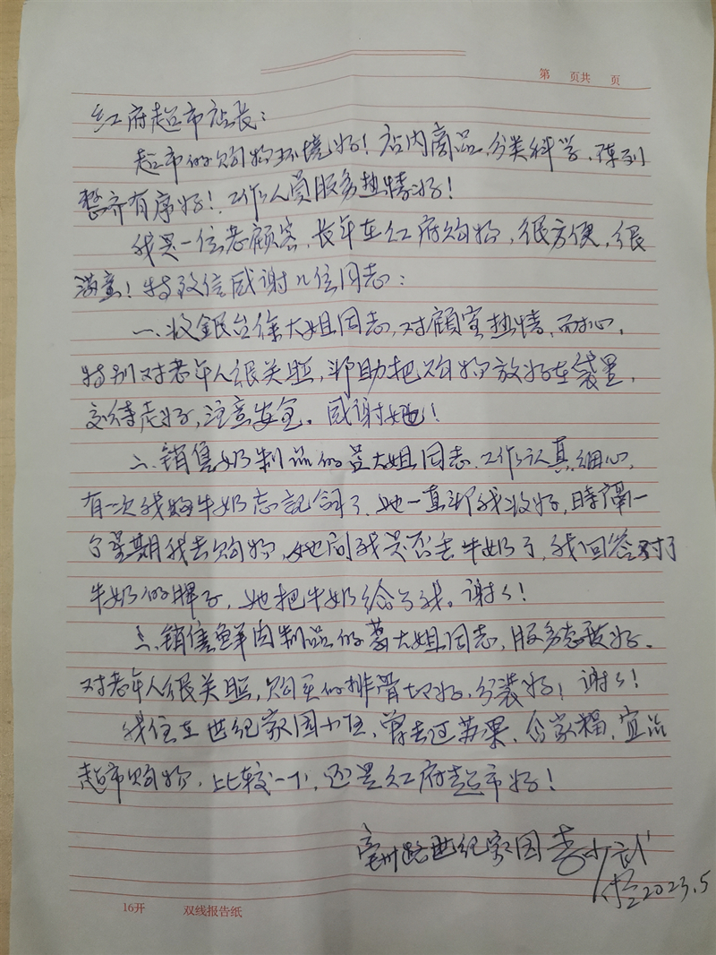 顧客的表揚(yáng)既是鼓勵(lì)也是鞭策,紅府超市今后將始終以顧客為中心、以服務(wù)為本,為廣大消費(fèi)者提供更加優(yōu)質(zhì)的商品和服務(wù)。