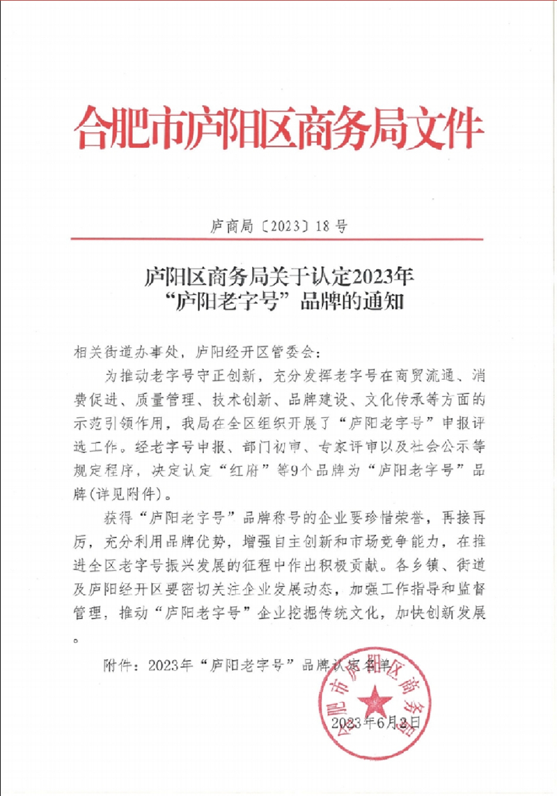 2023年6月2日,2023年度“廬陽(yáng)老字號(hào)”評(píng)選結(jié)果出爐,紅府超市被認(rèn)定為“廬陽(yáng)老字號(hào)”!