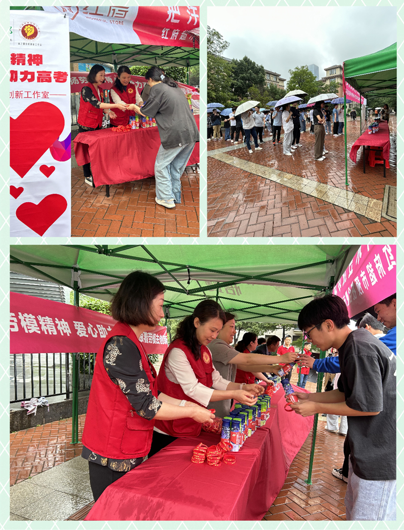 活動(dòng)當(dāng)天,工作室準(zhǔn)備了1800份送考禮包,禮包內(nèi)是營養(yǎng)酸奶和加油手環(huán),希望通過點(diǎn)滴心意給學(xué)子們帶去一份營養(yǎng)和鼓勵(lì)。當(dāng)日,安徽省商之都工會(huì)主席孫益梅一同前往,帶去商之都給學(xué)子們的祝福,雖然大雨滂沱,工作室的成員們依然保持熱情,積極為學(xué)子們發(fā)放禮包,整個(gè)活動(dòng)井然有序的進(jìn)行,充分展現(xiàn)了勞動(dòng)模范新風(fēng)采。