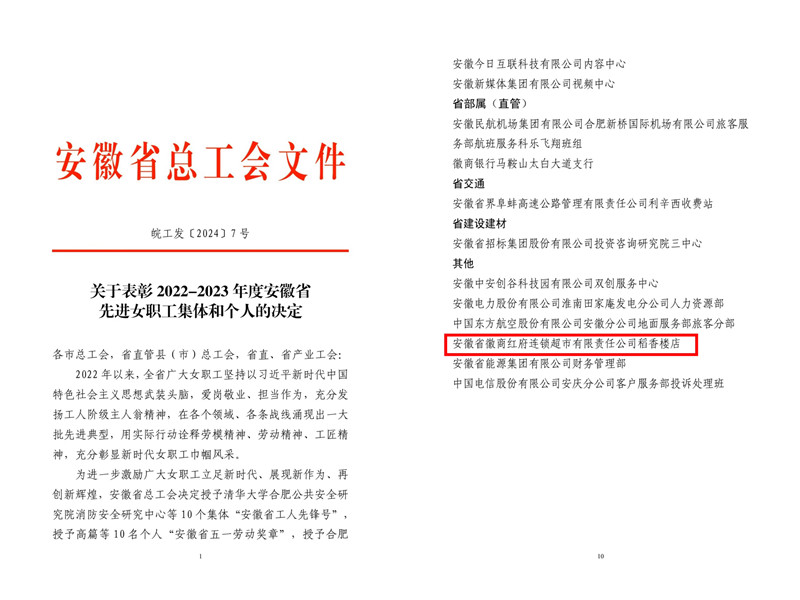 3月11日,安徽省總工會公布2022-2023年度安徽省先進(jìn)女職工獲獎名單,紅府稻香樓店榮獲“安徽省五一巾幗標(biāo)兵崗”稱號。