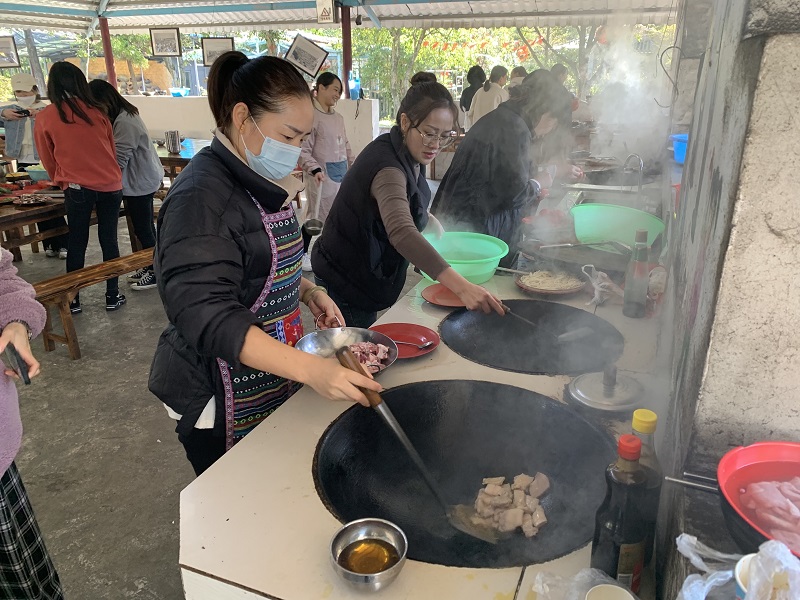 本次活動(dòng)分4個(gè)小組進(jìn)行比拼,每個(gè)小組在組長的帶領(lǐng)下烹飪美味。11月8日一大早,各個(gè)小組就帶著準(zhǔn)備好食材來到了紅村拓展基地。組長給每位組員分了工,組員們各司其職,洗菜、燒火,燒菜......忙得不亦樂乎,精心準(zhǔn)備午餐。比拼現(xiàn)場一片歡聲笑語,紅村上空炊煙裊裊,空氣中彌漫著大鍋灶的香味。