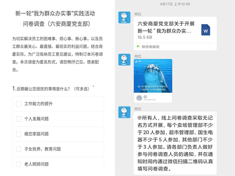 為持續(xù)鞏固拓展黨史學習教育成果,貫徹落實省委“一改兩為”大會精神,不斷增強員工的幸福感和歸屬感,近日,六安商廈黨支部在疫情特殊時期結(jié)合工作實際,創(chuàng)新性運用“問卷網(wǎng)”小程序平臺,制作了六安商廈黨支部我為群眾辦實事征集意見表,同時采取撥打支部黨務(wù)工作者電話、以及支委定向聯(lián)系相結(jié)合的方式,深入調(diào)研群眾需求。