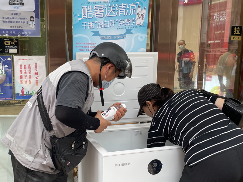中心廣場黨支部“紅?領(lǐng)?帶”服務(wù)隊工作人員先后來到各個防疫點,將冰鎮(zhèn)的礦泉水送到堅守在防疫一線的安保人員手中,叮囑大家要做好防暑降溫工作,勞逸結(jié)合,保重身體。同時商場在A座東門、一樓總服務(wù)臺等處設(shè)置多個免費發(fā)放點,供過往的外賣員、交警、環(huán)衛(wèi)工人、商場員工、顧客等人群免費領(lǐng)取飲用水。期間,不斷有人來到領(lǐng)取點取用。一位滿頭大汗的快遞小哥來到領(lǐng)取點,取出瓶裝“涼白開”,仰頭灌進(jìn)幾口后,長舒了一口氣,說道:“真的感謝商之都,還能想到我們,為我們提供免費的冰水降溫”。