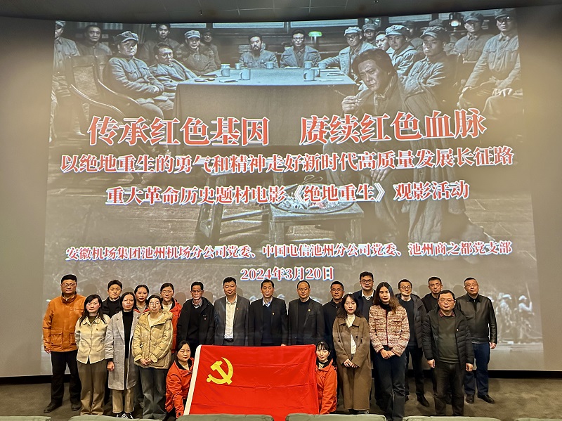 3月20日下午,池州購物中心黨支部與安徽機(jī)場(chǎng)集團(tuán)池州機(jī)場(chǎng)分公司黨委、中國電信池州分公司黨委聯(lián)合開展“傳承紅色基因,賡續(xù)紅色血脈”黨建共建觀影活動(dòng),組織觀看重大革命歷史題材影片《絕地重生》,引導(dǎo)黨員更好地傳承紅色基因、賡續(xù)紅色血脈,弘揚(yáng)革命精神。