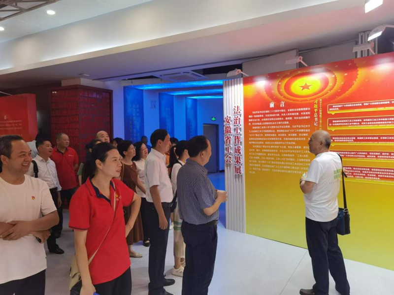 大家首先參觀了位于三樓的安徽省法治宣傳教育長廊,“尊法守法·攜手筑夢”安徽省工會法治化成果展。該展覽以“尊法守法·攜手筑夢”為主題,通過文字、圖片、實(shí)物等多種形式,全面展示了自“八五”普法規(guī)劃實(shí)施以來,安徽省工會在群團(tuán)建設(shè)及推動工會工作法治化方面取得的豐碩成果。