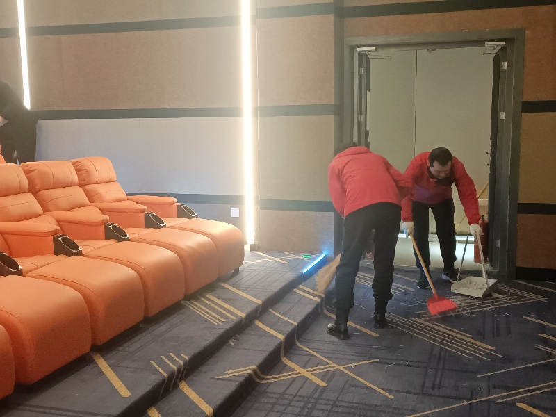 新影城通過(guò)一個(gè)月的共同努力順利完成前十多項(xiàng)招投標(biāo)活動(dòng),經(jīng)過(guò)一系列裝飾,設(shè)備采購(gòu)、調(diào)試、消防的驗(yàn)收及各種證件的辦理,終于圓滿完工。大家看到屬于自己新的影城,信心倍增,干勁十足,有條不紊分工合作,一起拖地、擦玻璃、抹桌椅,打掃近兩個(gè)小時(shí),就將影城環(huán)境衛(wèi)生打掃干干凈凈、亮麗一新,給觀眾一個(gè)全新的體驗(yàn),為迎接春節(jié)期間影院“開(kāi)門(mén)紅”做好滿心的服務(wù)!