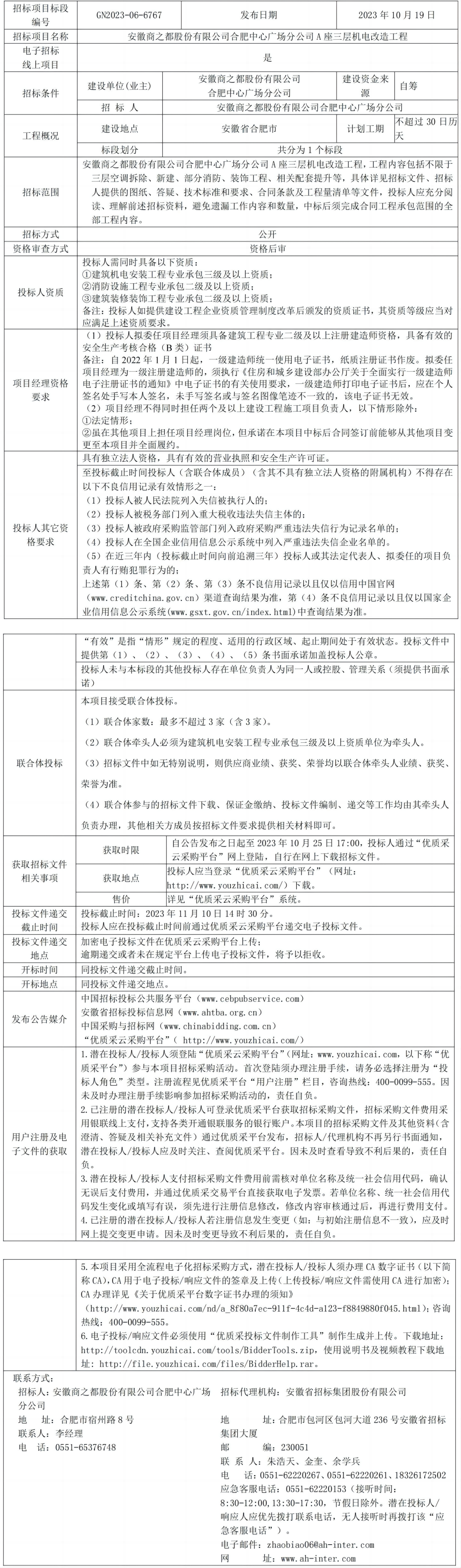 安徽商之都股份有限公司合肥中心廣場分公司A座三層機電改造工程招標公告