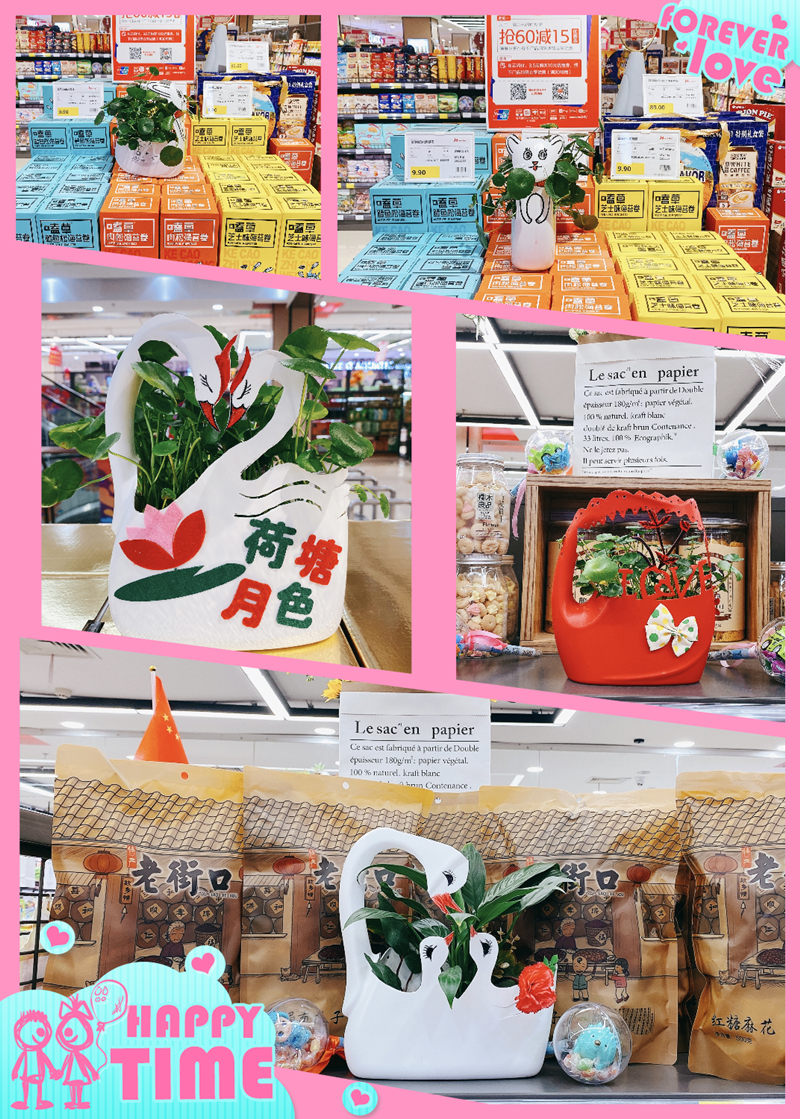 在做好日常工作的同時(shí),她常常思考怎樣給顧客帶來(lái)不一樣的購(gòu)物體驗(yàn),吸引更多的顧客“走進(jìn)來(lái)、留下來(lái)”。商品陳列具有美化門(mén)店整體效果、沖擊顧客視覺(jué)感觀、增強(qiáng)賣(mài)場(chǎng)氛圍、提升銷(xiāo)售業(yè)績(jī)的效果,是超市一個(gè)重要經(jīng)營(yíng)環(huán)節(jié),也是她工作內(nèi)容之一,她就想著能不能在這方面下功夫。由于她平時(shí)在家就喜歡做些手工,養(yǎng)一些花花草草,于是她就想,把這些用在門(mén)店陳列上,會(huì)不會(huì)為陳列增添一番趣味,吸引顧客駐足。說(shuō)干就干,她馬上把家里積攢的一些洗衣液瓶子拿出來(lái),根據(jù)瓶子的形狀琢磨著做成哪種造型,同時(shí)也在網(wǎng)上學(xué)習(xí),查閱相關(guān)手工知識(shí),最后做成了天鵝、鴨子、貓咪等眾多可愛(ài)的卡通動(dòng)物造型,并在里面種上各種小綠植,顯得更加生機(jī)勃勃。果然,這些創(chuàng)意美陳馬上吸引了很多顧客的目光,尤其是小孩子,更是停留在前面都舍不得走了,看到孩子們那渴望的目光,王良云也很大方的送給了孩子們,孩子們歡聲雀躍,家長(zhǎng)也對(duì)門(mén)店的貼心服務(wù)大為贊嘆,成為了紅府超市的忠實(shí)顧客。其他兄弟門(mén)店知道后,也紛紛邀請(qǐng)王良云前往自家門(mén)店“傳幫帶”,將經(jīng)驗(yàn)推廣,給顧客營(yíng)造不一樣的購(gòu)物體驗(yàn),大家集思廣益,也冒出了更多的創(chuàng)意火花。