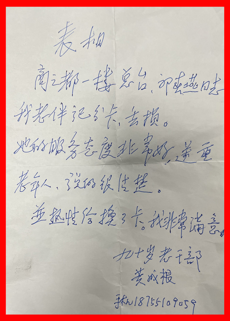 2021年5月12日,一位九十多歲的黃姓老人來到中心廣場A座一樓總服務(wù)臺(tái),送來了一封言辭質(zhì)樸的感謝信,感謝總服務(wù)臺(tái)工作人員郭春艷為老伴及時(shí)解決積分卡丟失的問題。