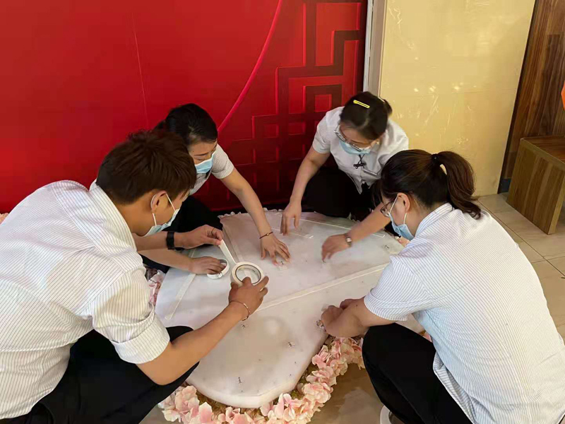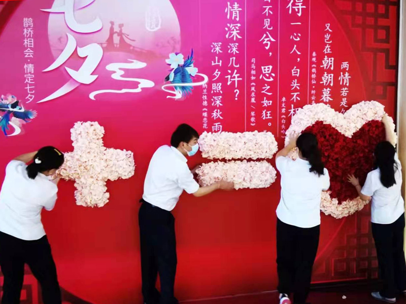 為了響應(yīng)公司降本增效的號(hào)召,客戶營銷部充分調(diào)動(dòng)部門員工積極性,利用各自的特長,嘗試自己動(dòng)手創(chuàng)作搭建。大家同力協(xié)契共同構(gòu)思,將傳統(tǒng)的“七夕”鵲橋文化與現(xiàn)代的“網(wǎng)紅花束”相融合,打造七夕“驚喜”。制作“網(wǎng)紅墻”制作所需材料均是在網(wǎng)上多家比價(jià)精心選購。現(xiàn)場組合安裝也是自己動(dòng)手,難題不斷——在大理石墻面不能掛釘固定花環(huán)的情況下,為了保證安全地將花環(huán)固定在墻面上,大家想了很多辦法:雙面膠、無痕釘、玻璃膠......經(jīng)過一整天的努力,終于將花環(huán)固定在所需位置,解決了安全問題的同時(shí),又保證了顧客拍照的最佳效果。