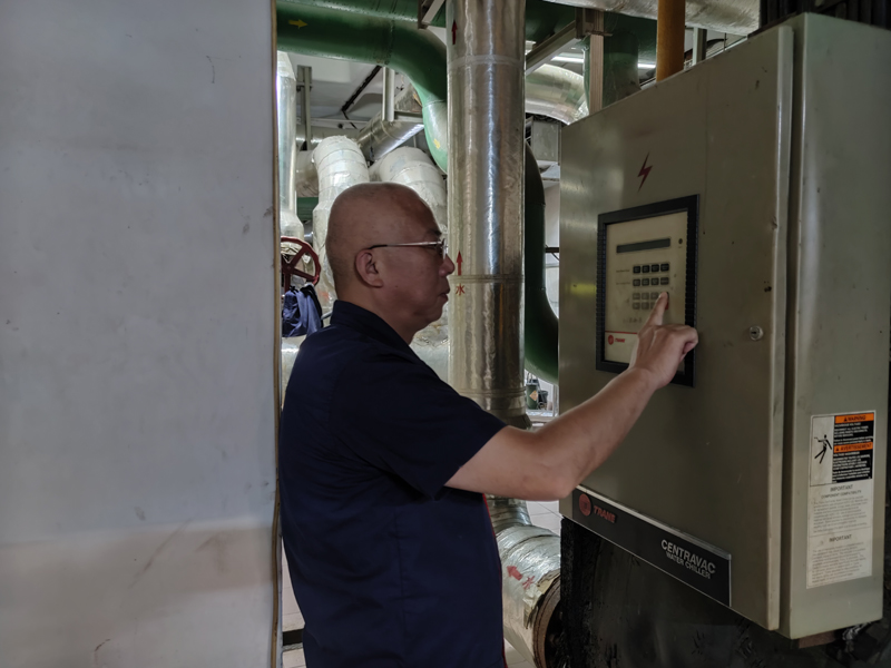國慶期間,持續(xù)高溫。10月4日,物業(yè)工程部員工衛(wèi)民早早來到崗位上,認真做好一應(yīng)營業(yè)準備工作,準時啟動空調(diào)1號主機。(文/圖 尚廣寒)