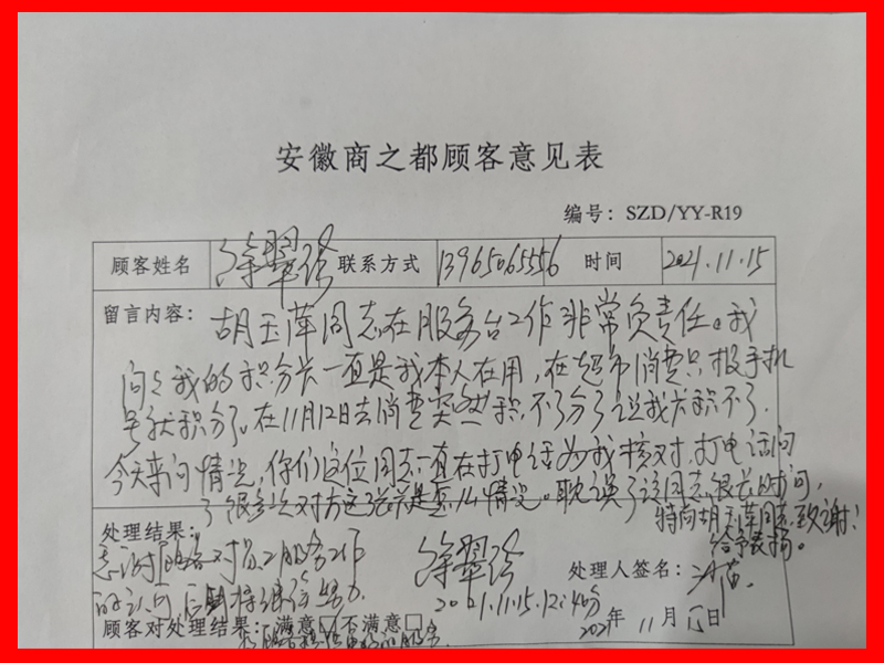 11月15日,中心廣場員工胡玉萍因工作認(rèn)真負(fù)責(zé)受到顧客留言表揚。