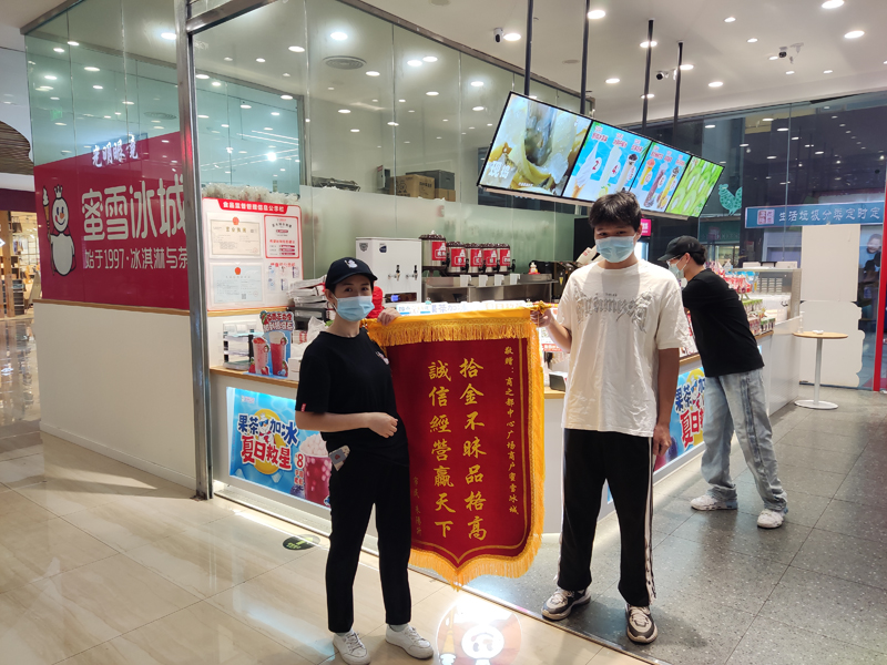 9月12日上午,中心廣場蜜雪冰城迎來一位特殊的客人,他手里拿著錦旗,錦旗上寫著“拾金不昧品格高、誠信經營贏天下”,感謝蜜雪冰城員工拾金不昧。