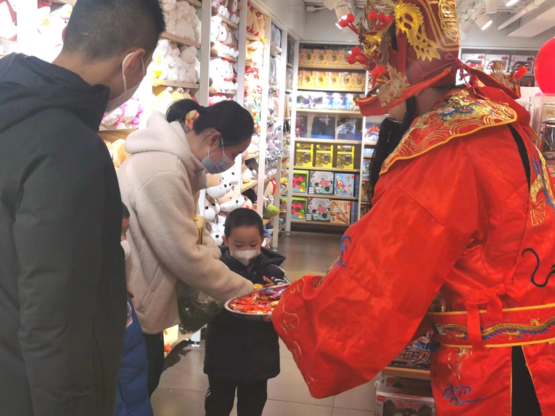 “福、?、壽、財”神由中心廣場員工扮演,戲服的扮相年味十足,“過大年”的氛圍瞬間拉滿。巡游中還增加了“金幣”“金元寶”糖果的發(fā)放環(huán)節(jié),一聲聲“新年快樂、財源廣進”將大年初五的年味渲染的更加濃厚。顧客、商家和員工拿到寓意美好的糖果,收到濃濃的祝福,收獲了新年的驚喜和快樂。