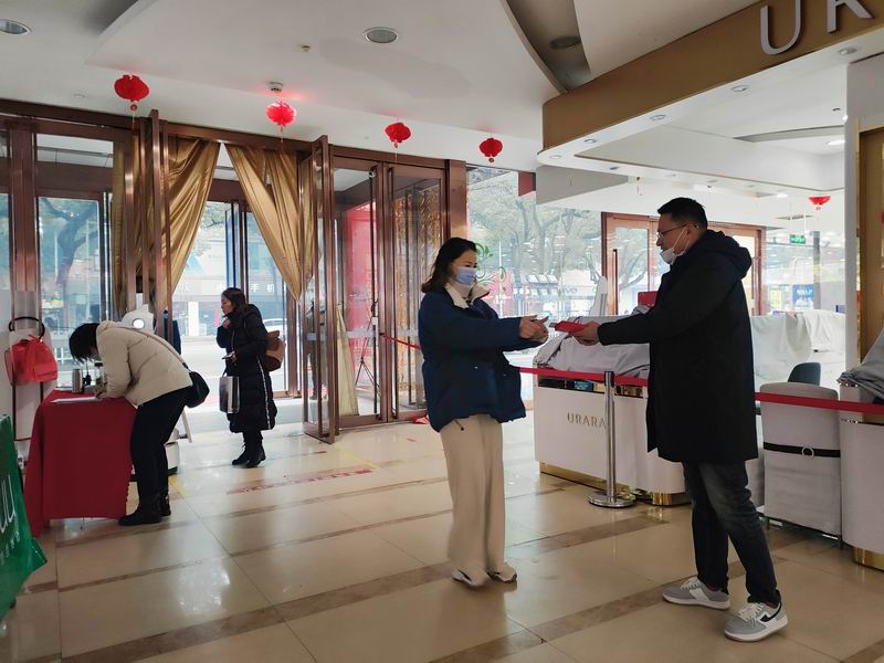 2022年2月1日,農歷大年初一,宣城商廈副總經理芮應平在門前迎接上班的員工并派發(fā)紅包。