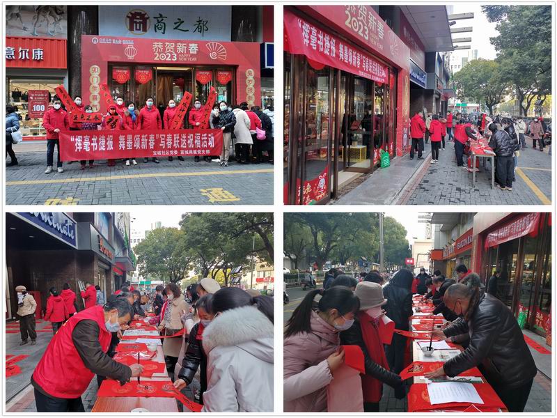 “敬亭山下春光好,宛陵城里瑞氣濃?!薄褒堯v虎躍人間事,鳥語花香天下春?!薄藢ΜF(xiàn)有生活的幸福與滿足,更蘊含了對祖國的深深熱愛。一副副對聯(lián),一句句祝福,把濃濃的新春喜氣傳遞給了在場的每一位顧客,受到了廣泛歡迎和一致好評。