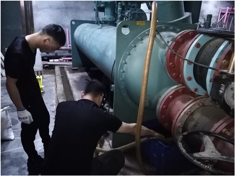 為做好冷凝器管道潔凈、暢通的維護(hù)保養(yǎng),師傅們首先打開冷凝器進(jìn)、出水端蓋,外接水泵對機(jī)體管道進(jìn)行注水,并稀釋固態(tài)化學(xué)除垢劑,進(jìn)行水循環(huán)的管道浸泡,最后拆卸冷凝器后端蓋,利用通炮機(jī)給每一根管道“清清腸”,確保夏季中央空調(diào)機(jī)組的安全運(yùn)行。(文/圖 劉濤)