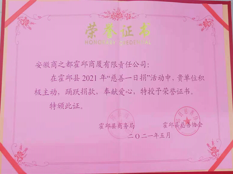 霍邱商廈積極參與霍邱縣2021年“慈善一日捐”活動,獲得霍邱縣商務(wù)局、霍邱縣慈善總會頒發(fā)的榮譽證書。
