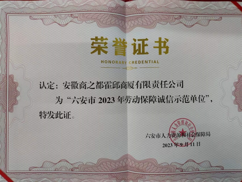 近日,在六安市人力資源和社會(huì)保障局開(kāi)展的2023年度勞動(dòng)保障守法誠(chéng)信等級(jí)評(píng)價(jià)工作中,霍邱商廈榮獲“六安市勞動(dòng)保障誠(chéng)信示范單位”榮譽(yù)稱號(hào)。