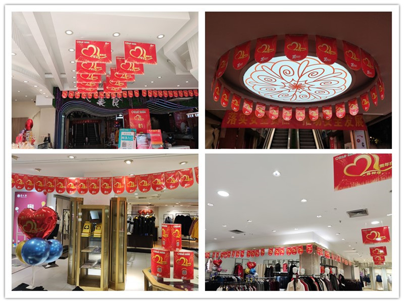 沿街商鋪窗貼、廣告位宣傳畫、內(nèi)場小吊旗、專柜彩色鋁箔氣球……各種富含21周年慶元素以及喜慶的紅色調(diào)的裝飾物,共同營造出濃濃的節(jié)慶氛圍。(文/圖 李海梅)