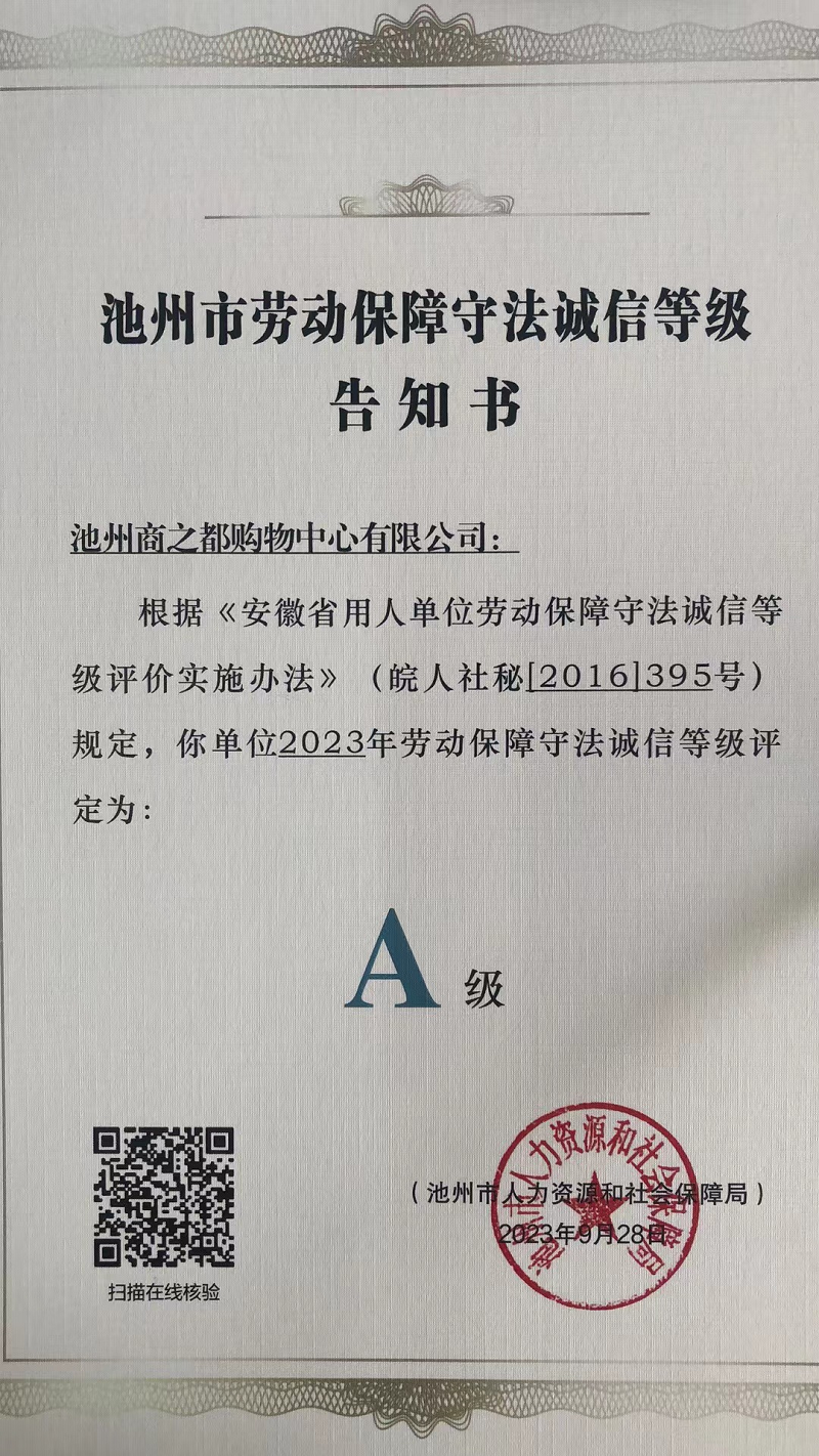 日前,池州購物中心積極申報、各級單位綜合評審和社會公示,購物中心被評定為2023年市本級勞動保障守法誠信“A級”單位。