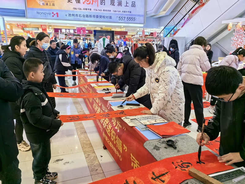 春節(jié)將至,年味兒漸濃。1月31日下午,池州購物中心開展“迎新春 寫春聯(lián) 送祝?!被顒?。