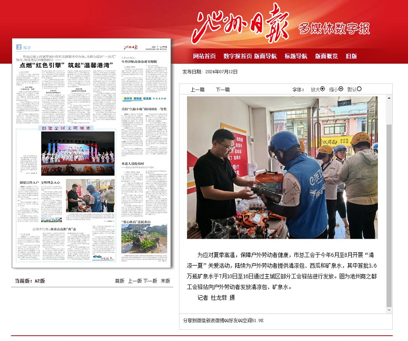 連日來,持續(xù)的高溫,“烤”驗著池城的戶外勞動者們。池州購物中心積極踐行國有企業(yè)的責任與擔當,7月以來,在工會驛站開展“送清涼”活動,陸續(xù)為外賣小哥、環(huán)衛(wèi)工人等戶外勞動者送上清涼包、戶外水壺、礦泉水等防暑降溫物品。池州商之都工會驛站“送清涼”活動受到了池州日報的關注和報道。